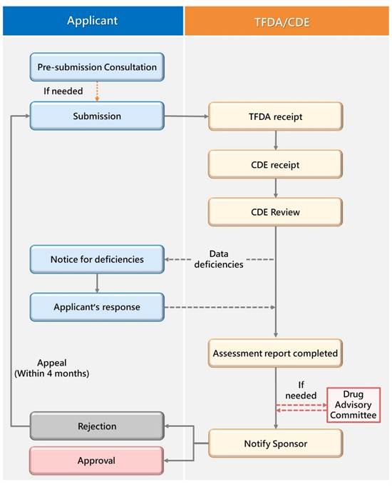 The TFDA is responsible for reviewing the trial design, feasibility, and overall compliance with regulatory requirements. The Center for Drug Evaluation (CDE), a non-profit organization authorized by the TFDA, conducts technical reviews of submitted data.